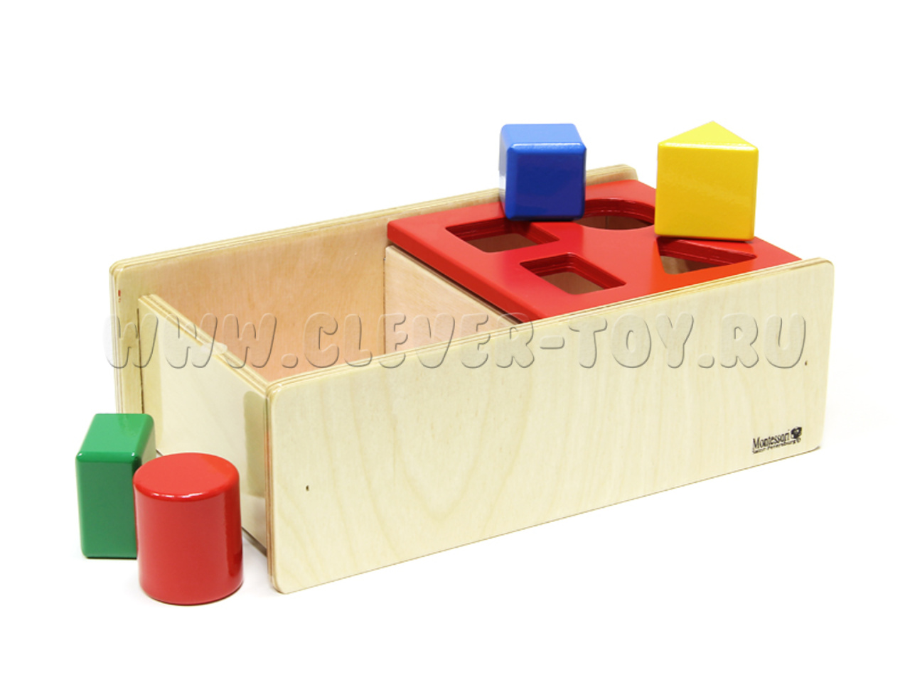 В этот уникальный сортер входят 4 основные фигуры: красный цилиндр, синий кубик, зелёная прямоугольная призма, желтая треугольная призма. Фигуры крупного размера и очень удобны для захвата маленькой ручкой. Присутствует очень удобная перекидная крышка, которая способствует развитию нового движения малыша.