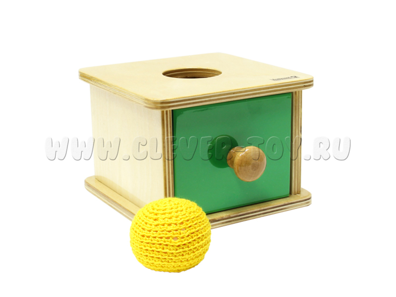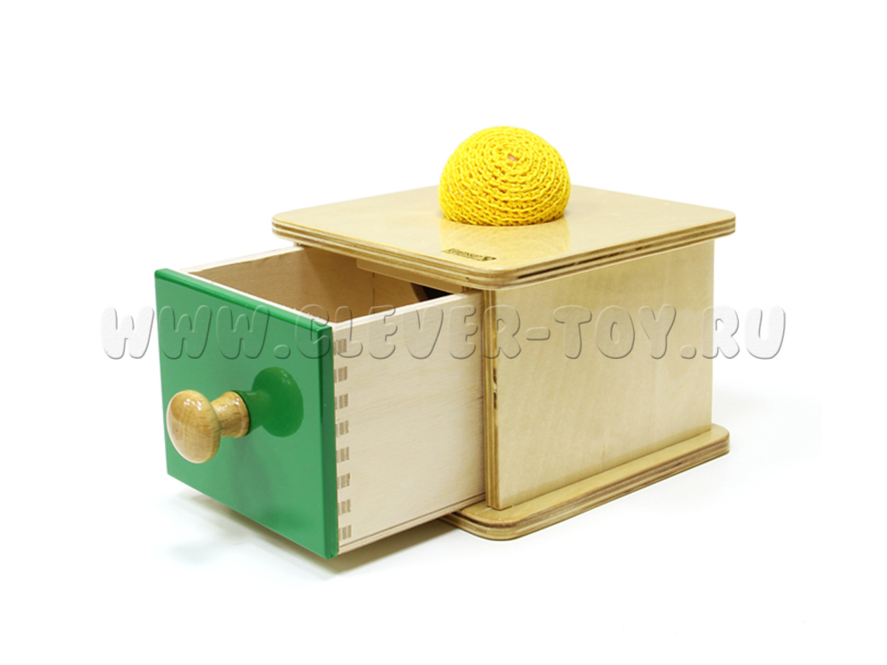 Игра надолго увлечёт вашего маленького исследователя. Задача проста: бросать мячик в отверстие, а затем искать его, выдвигая нижний ящик коробочки. Игра сделана так, чтобы Ваш малыш мог с лёгкостью протолкнуть мячик в отверстие, чтобы он провалился в коробочку. Чтобы обнаружить мячик, малыш с радостью будет открывать ящик, разввая координацию движений и умение действовать двумя руками одновременно. Родители должны показать малышу, как действовать: в первый раз взрослый проталкивает мячик и выдвигает ящик.