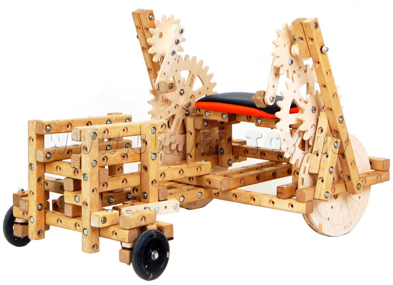 Состав конструктора “Дошкольник” включает 80 брусков из твёрдой уральской берёзы, около 300 болтов и гаек, сидушки с чехлами, колеса, шестерёнки, блок-ролики, ключи для сборки и систему хранения для мелких деталей.