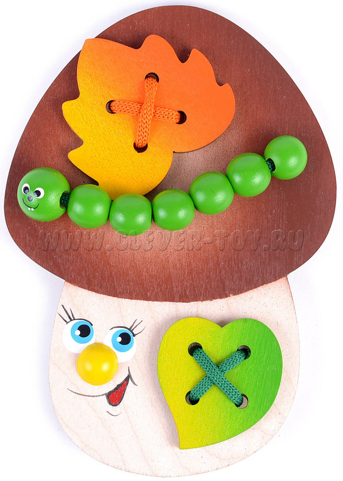 Шнуровка "Гриб Боровик" предназначена для развития мелкой моторики и координации движений в игровой форме. Ребенок узнает, как пришиваются пуговицы и научится делать стежки.