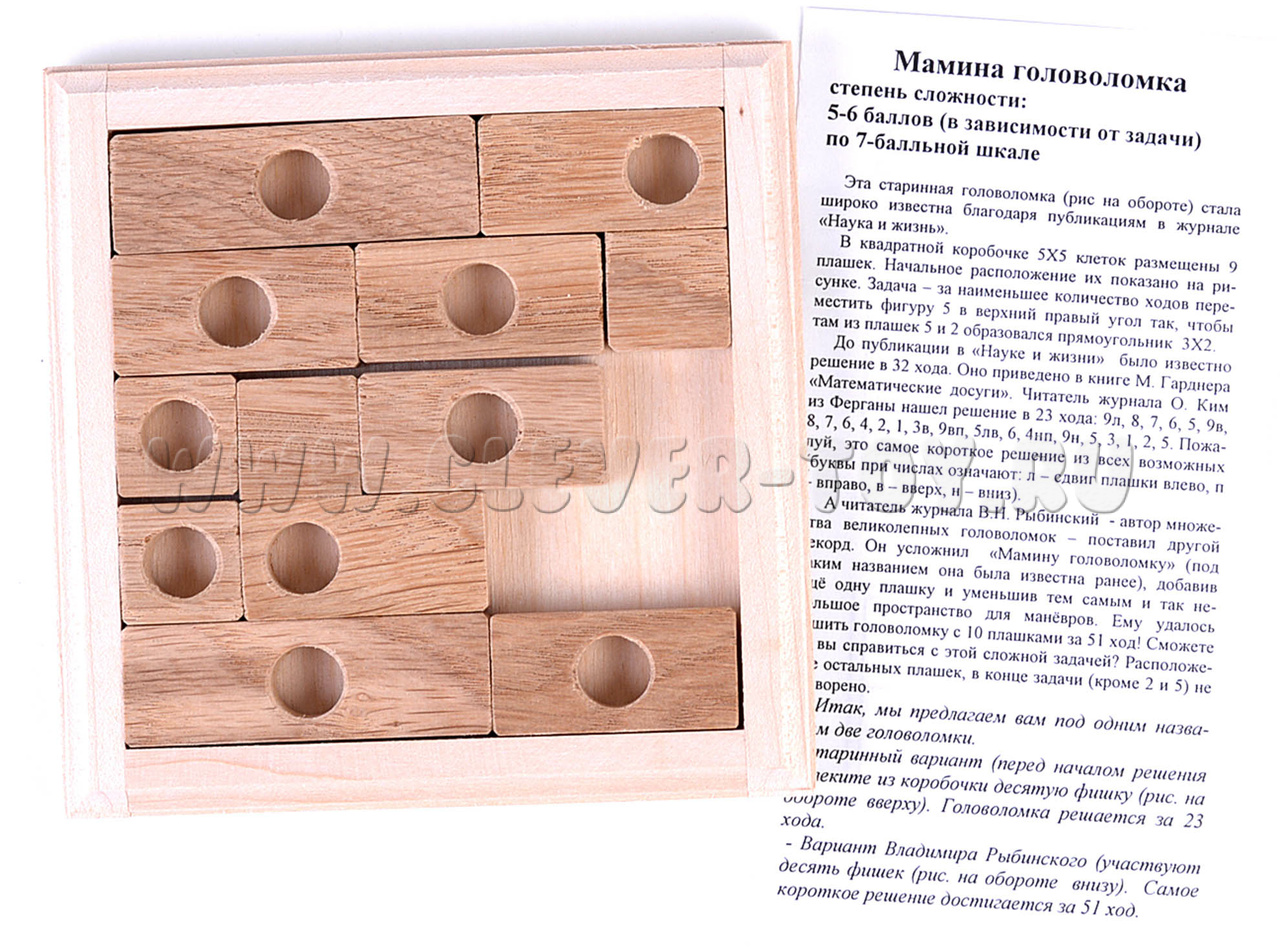 “Мамина головоломка” – логическая задача для тех, кто хочет испытать себя в чем-то новом. Эта головоломка связана с перемещением деталей на деревянной доске за определенное количество ходов. Это задание не из простых и оценивается авторами на 5-6 баллов из 7.
