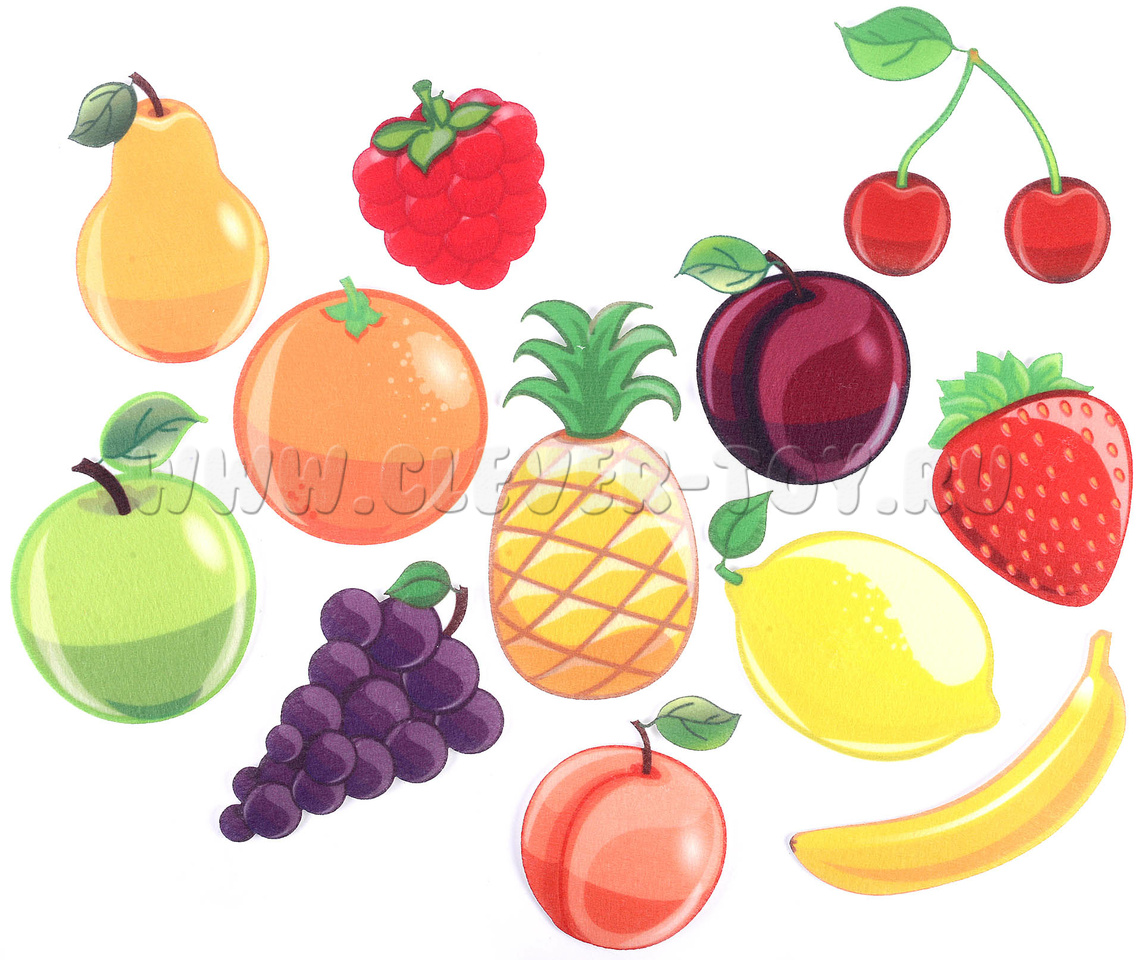 • Фигурки с изображением фруктов, ягод - 12 шт. (малина, слива, персик, банан, клубника, апельсин, яблоко, груша, вишня, виноград, лимон, ананас)