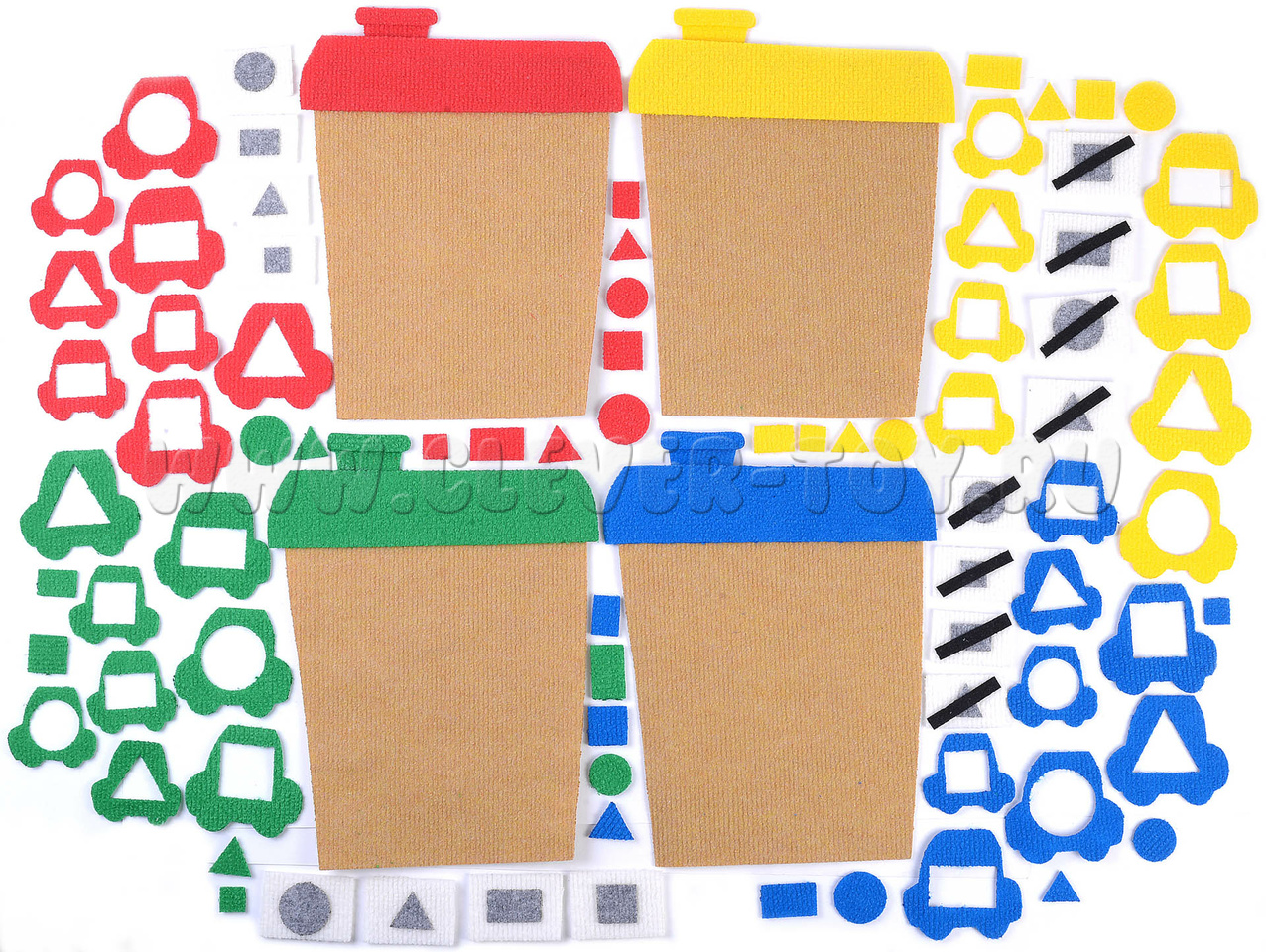 • гаражи для машинок 4 штуки: жёлтый, зелёный, синий, красный;