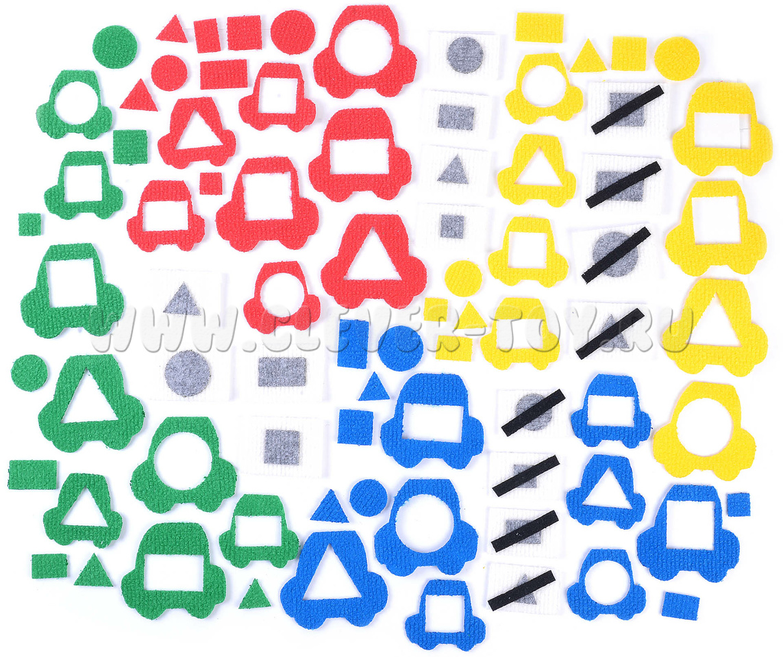 • карточки для геометрических фигур 8 штук, карточки с отрицанием ("не такая, как") 8 штук.