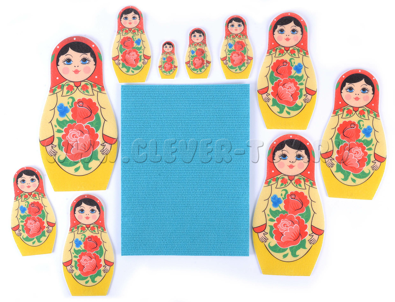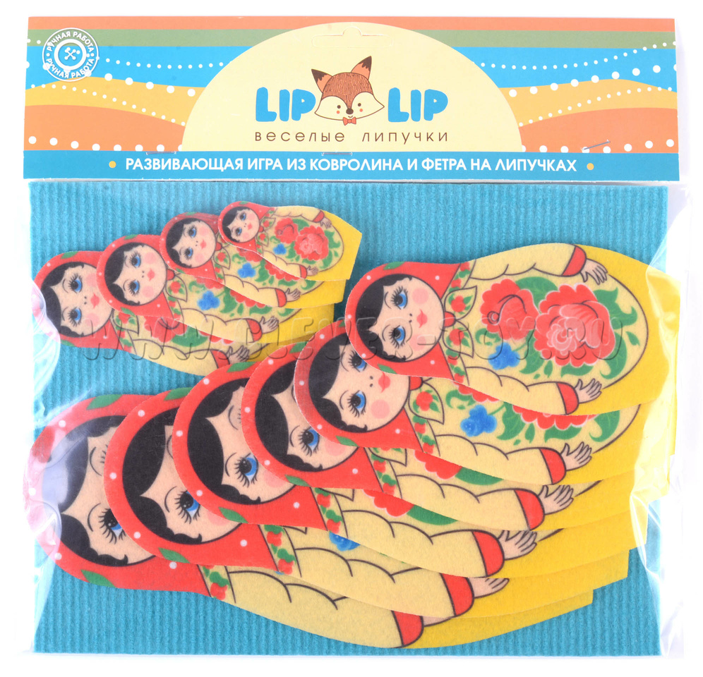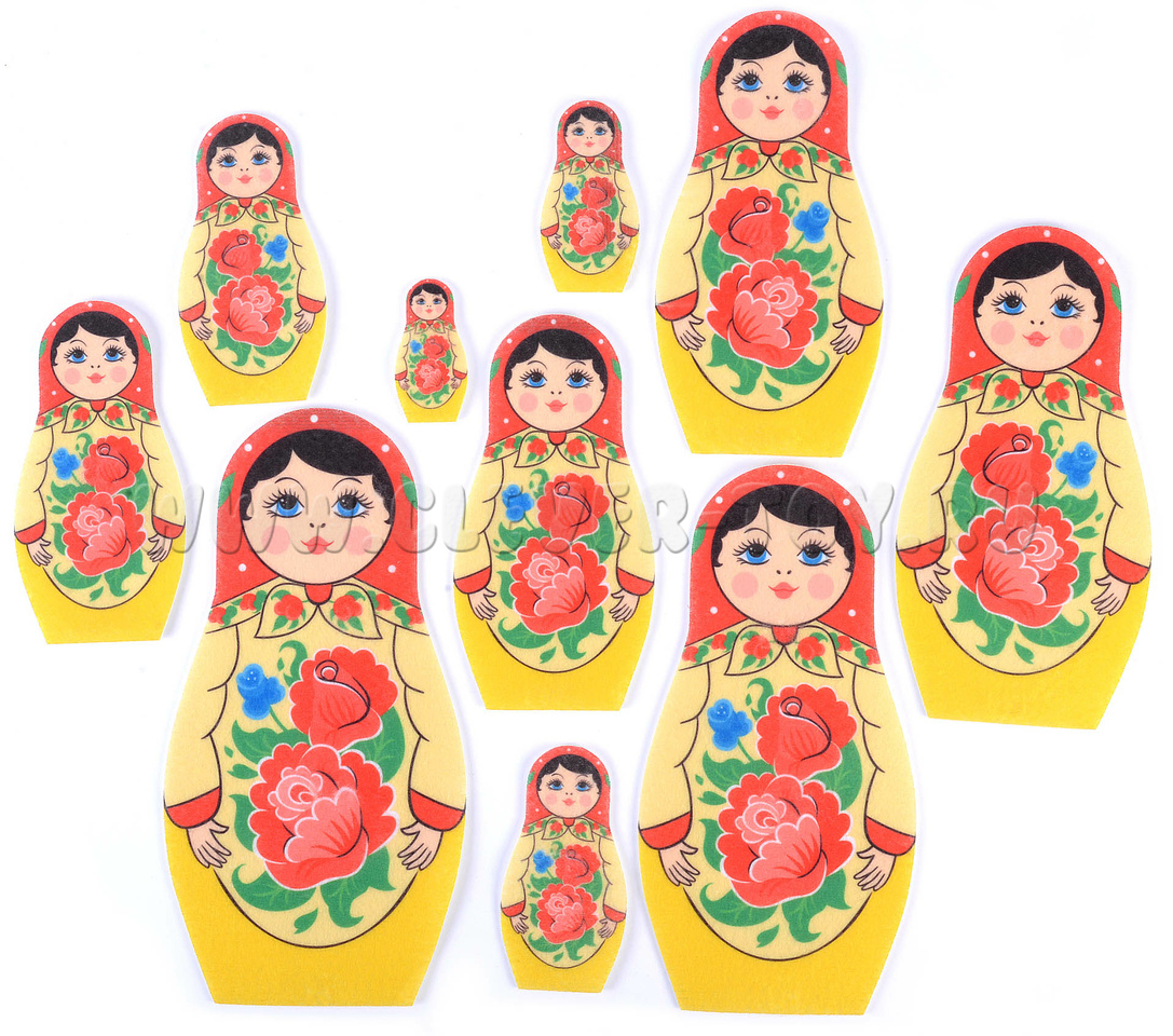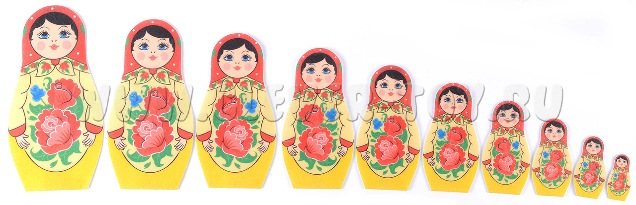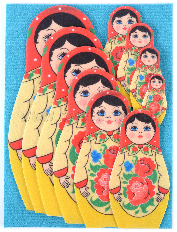 • 10 матрёшек из фетра разной высоты — от 6 до 25 см.