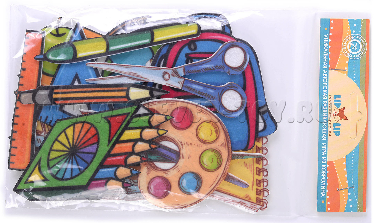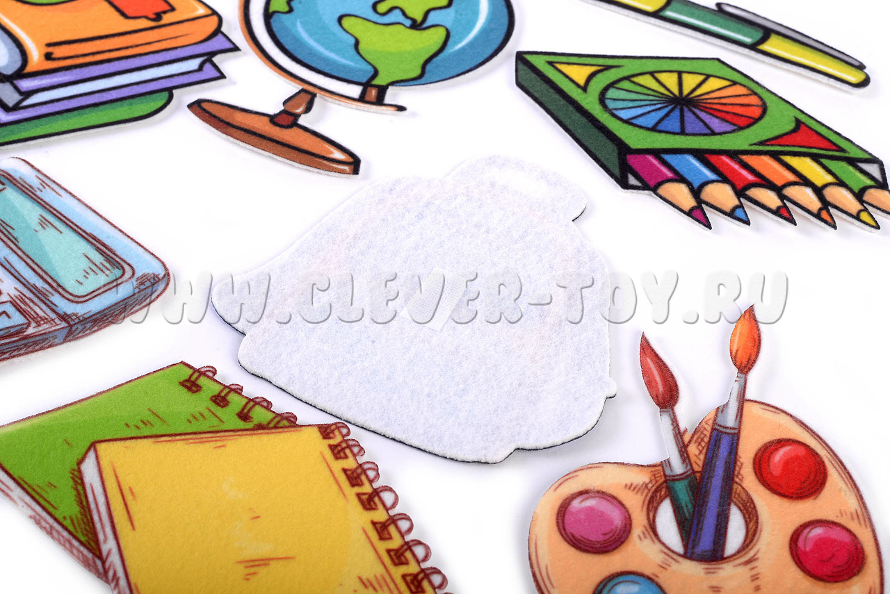 В комплекте 11 фигурок с изображениями школьных принадлежностей на липучках. Размеры фигурок: от 1,5×11 см до 9×12,5 см. Материал: фетр.