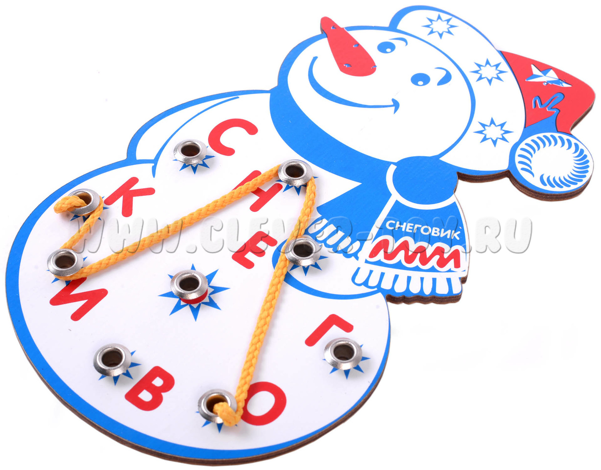 Как в нее играют: шнурок ребенок продевает в отверстие, затем закручивает его вокруг последующих букв, и таким образом составляет различные слова. Символ "звездочки" означает любую букву.