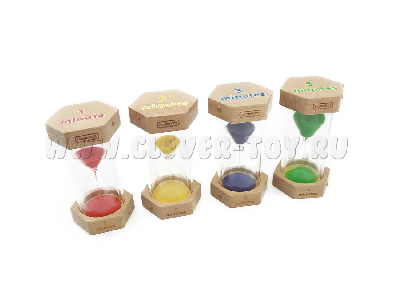 Каждый таймер заполнен песком разного цвета (красный, желтый, фиолетовый, зеленый). Минуты прописаны на английском языке.