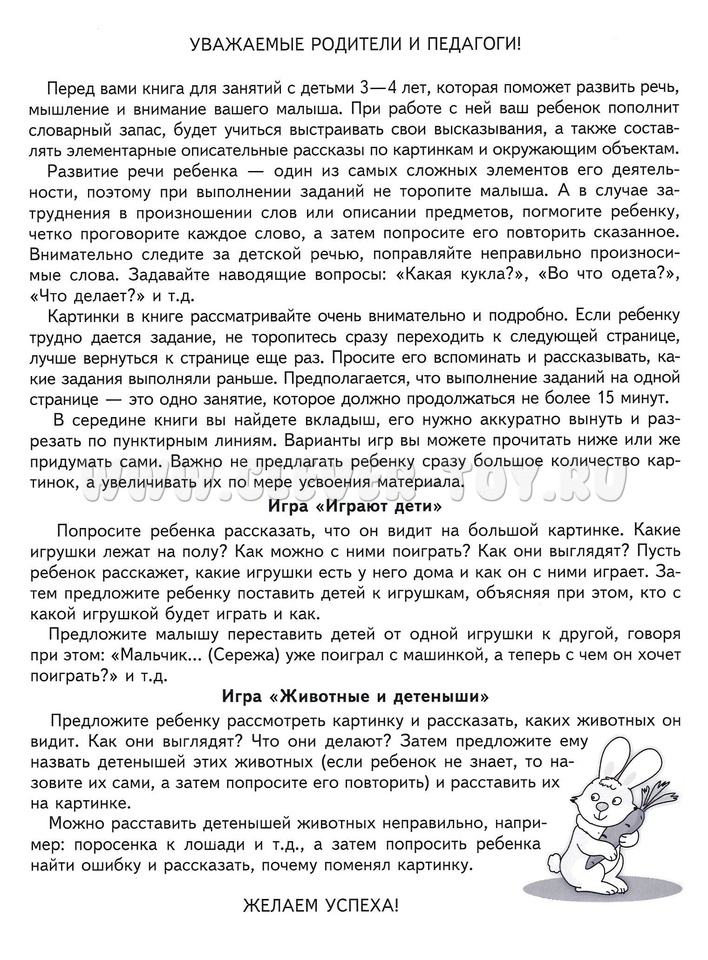 Картинки в книге рассматривайте очень внимательно и подробно. Если ребенку трудно дается задание, не торопитесь сразу переходить к следующей странице, лучше сделайте еще раз. Предполагается, что выполнение заданий на одной странице - это одно занятие (но не более 15 минут). В середине книги вы найдете вкладыш для речевых игр. Предназначено родителям и педагогами для занятий с детьми 3-4 лет.