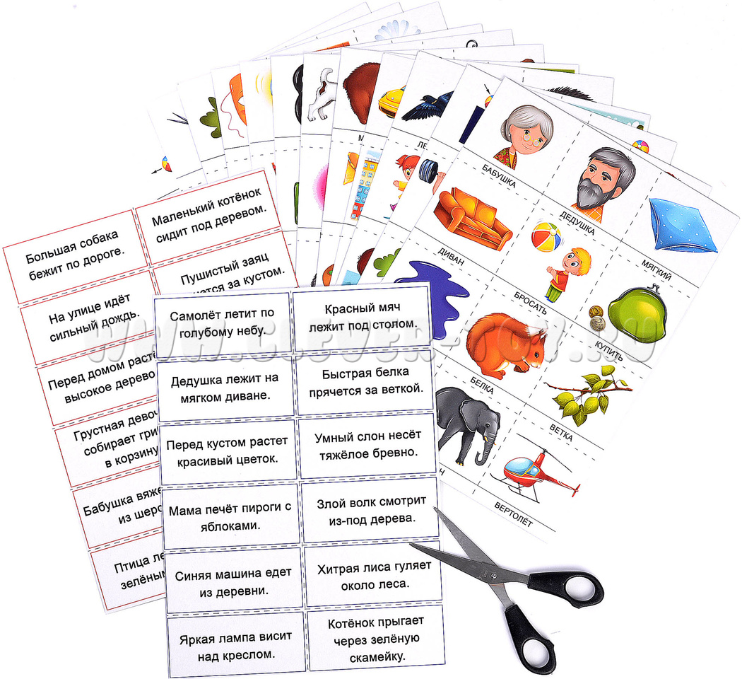 Перед началом игры родителю или педагогу необходимо разрезать карточки по пунктирным линиям. Получится 24 карточки с предложениями и 144 карточки с картинками и отдельными словами.