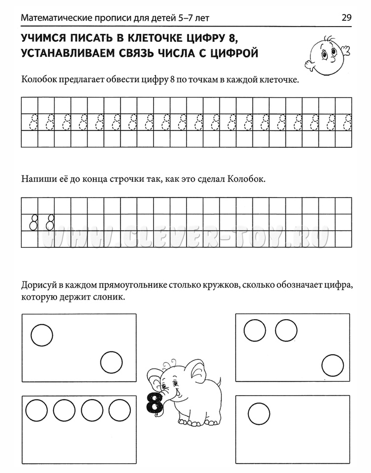 При проведении самоконтроля давайте ребёнку чёткие критерии правильно выполненного задания (например, ты должен был обвести цифру 5), сверяясь с которыми, он самостоятельно оценивает свою работу. С этой целью на каждой страничке нарисован Колобок-смайлик, у которого не обозначен ротик (эмоция), его должен изобразить ребёнок, оценивая свою работу.