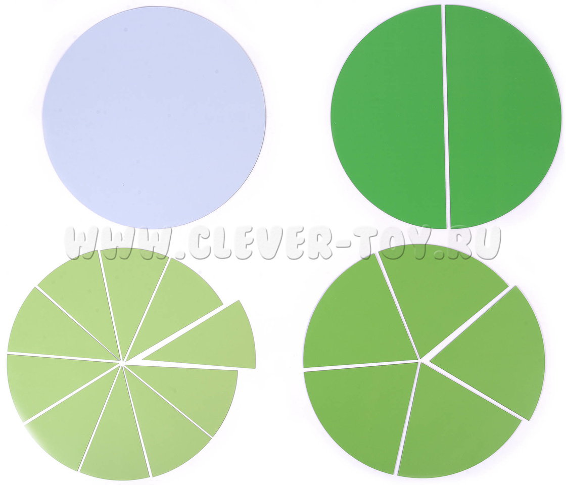 В наборе 36 магнитных карточек. Состав в описании изделия. 18 карточек - цветные части круга (от 1 до 1/10). 18 белых карточек с указанием величины дроби (от 1 до 1/10). Диаметр пособия в собранном виде 27 см.