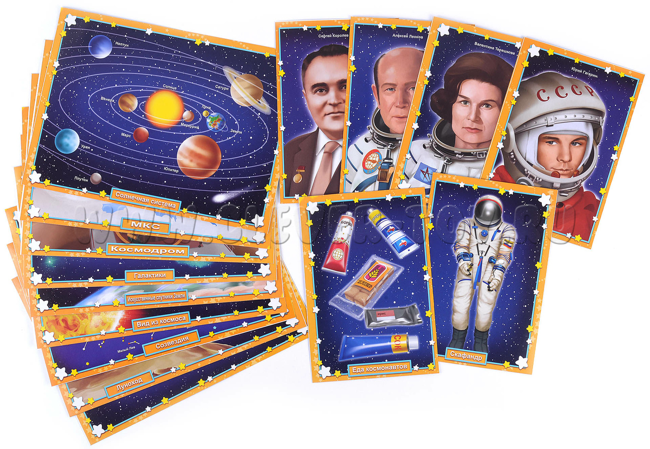 Используйте яркие наглядные картинки для индивидуальных или групповых бесед; расскажите детям о Космосе, планетах и звездах, созвездиях и галактиках, Солнечной системе, первых спутниках, космических кораблях, освоении Луны и космонавтах.