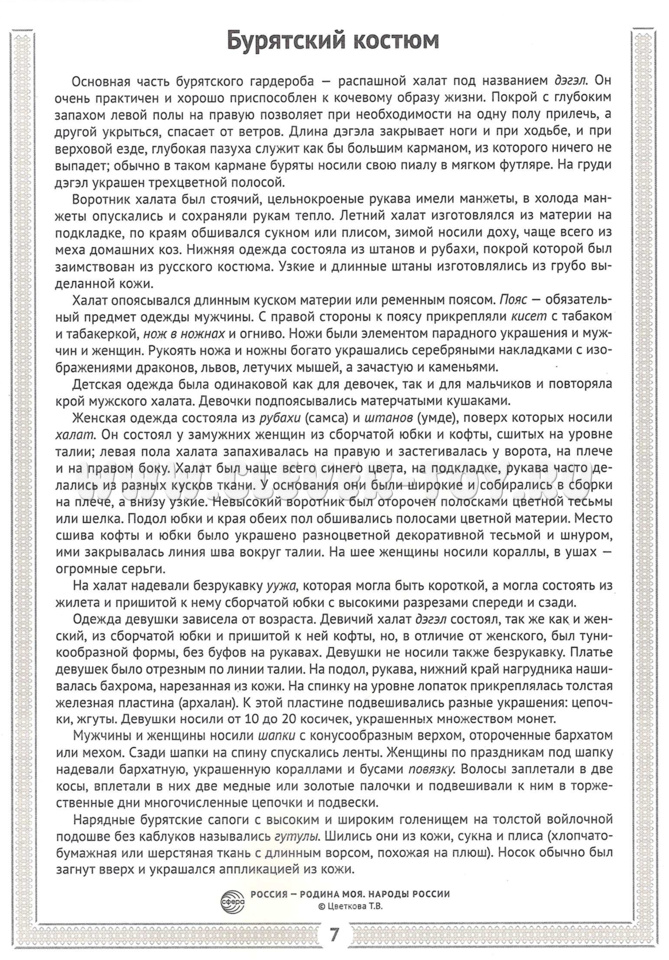 Каждый народ отличался своим уникальным стилем одежды, который варьировался в зависимости от региона. В нашем пособии представлены обобщённые варианты этих костюмов, отражающие их характерные особенности. Информация подана в сжатой форме, но при этом содержит все необходимые сведения для детей в возрасте от 6 до 11 лет.