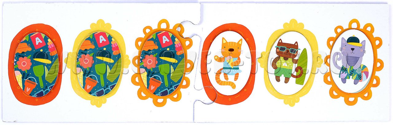 - Игра для поля с шезлонгами (обратная сторона игрового поля). Начинайте с заданий в зеленой рамке: воспроизводите заданную карточкой последовательность котят. Более сложные задания предлагают не только продолжить ряд, но и установить взаимосвязь и закончить последовательность самостоятельно. К этим заданиям стоит переходить, когда малыш уверенно справляется с зелеными карточками.