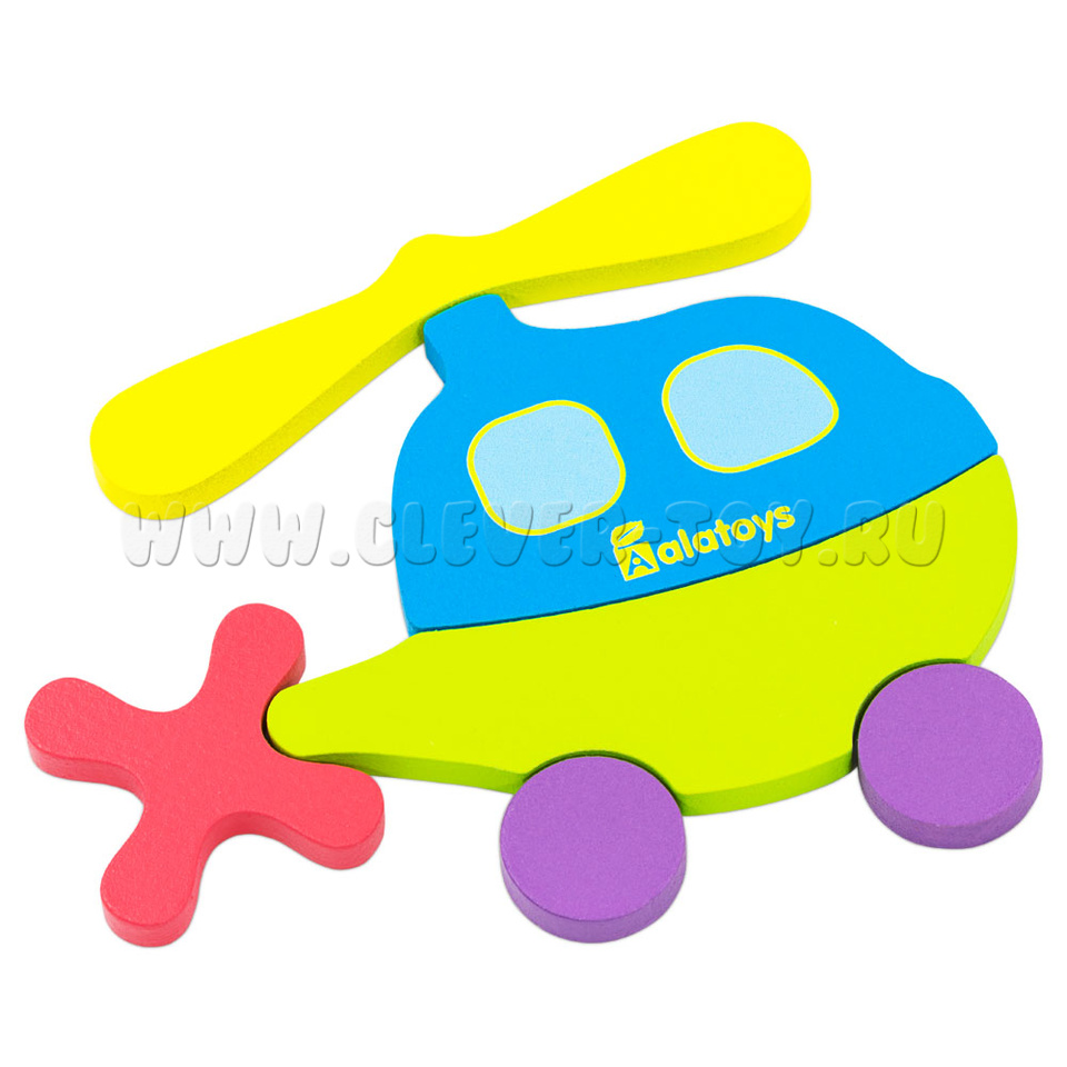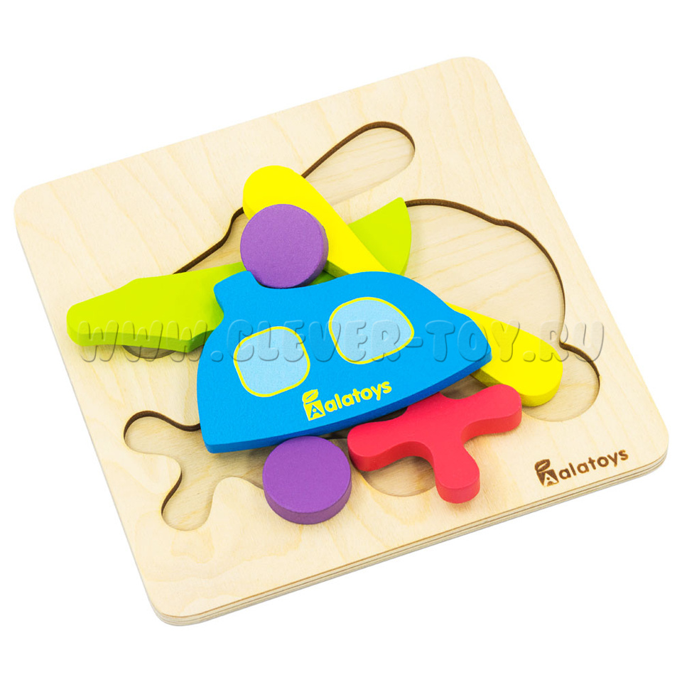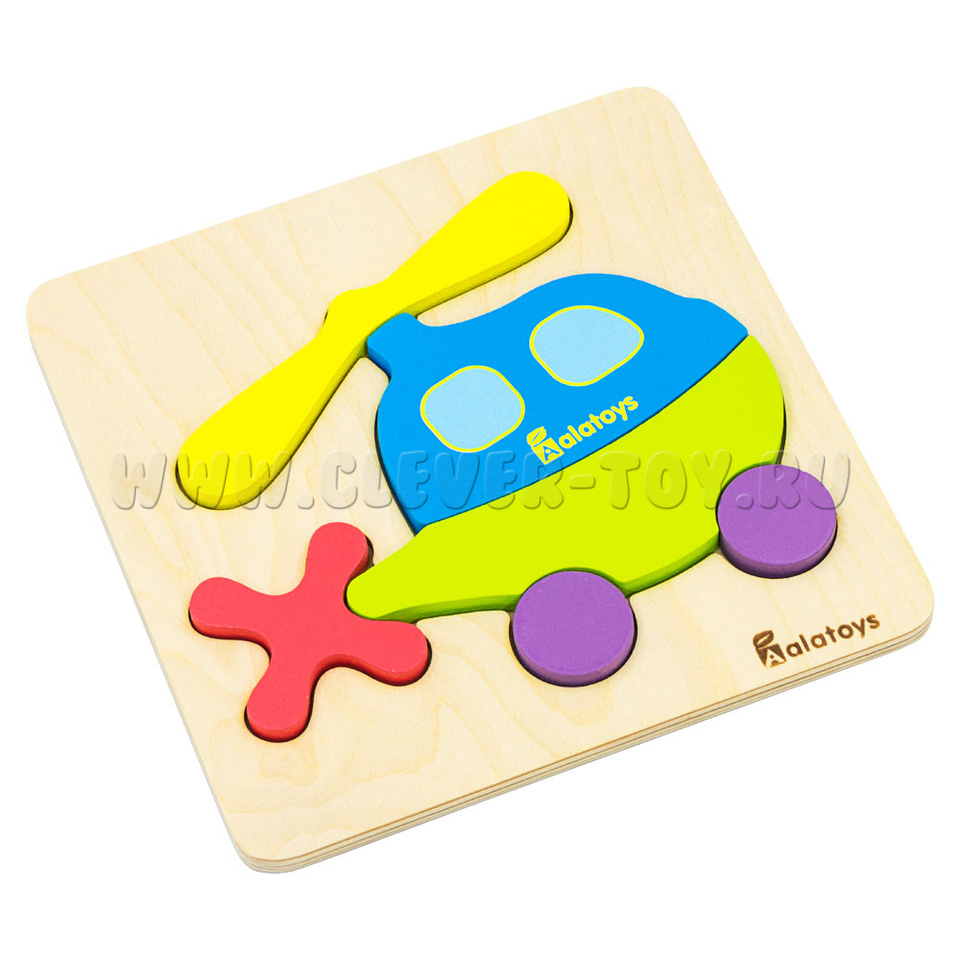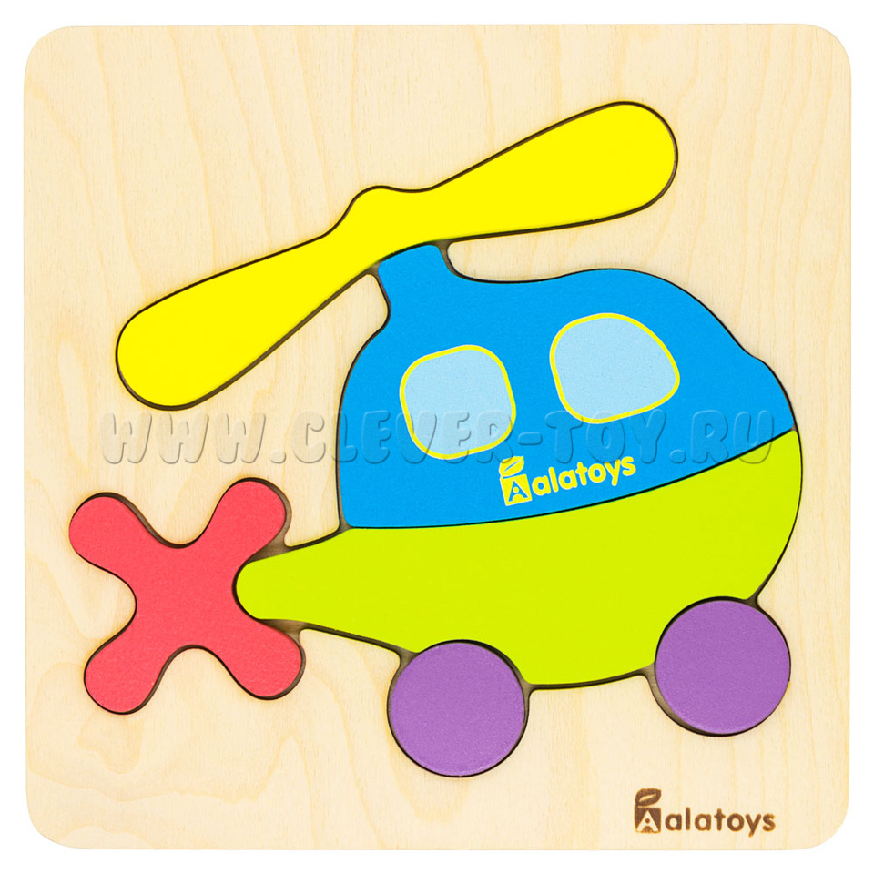 Развивающая игрушка пазл «Вертолёт» представляет собой деревянную основу с углублениями для размещения деталей вертолёта. Только правильно подобрав детали по форме и размеру, у ребёнка получится сложить правильные пазлы.