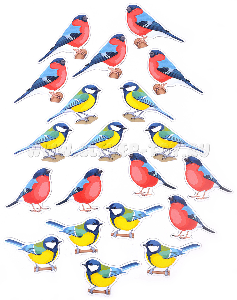 Кстати в наборе 10 снегирей и 10 синиц. Размер карточек варьируется от 6 до 7 см в высоту, а их ширина, как правило, 10 см.