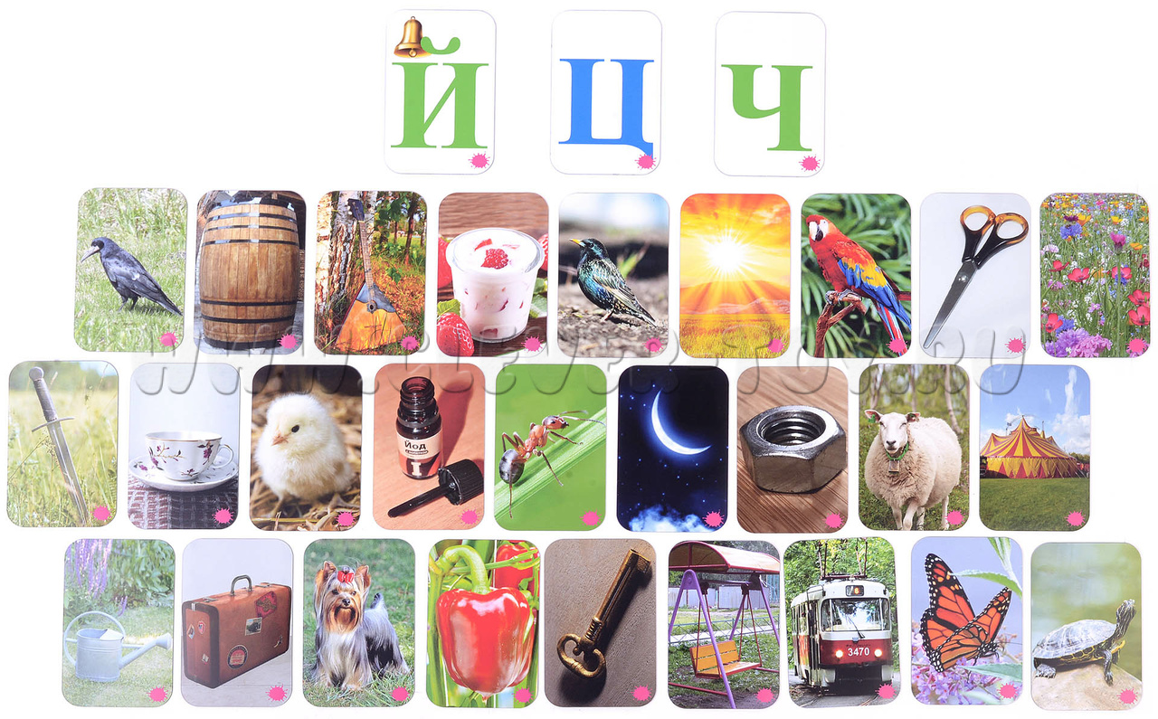 Ц, Ч, Й – Цирк, Цыплёнок, Цветы, солнЦе, овЦа, ножниЦы, переЦ, месяЦ, сквореЦ; Чашка, Черепаха, Чемодан, боЧка, бабоЧка, каЧели, граЧ, меЧ, клюЧ; Йогурт, Йорк, Йод, балалаЙка, гаЙка, леЙка, трамваЙ, попугаЙ, муравеЙ.