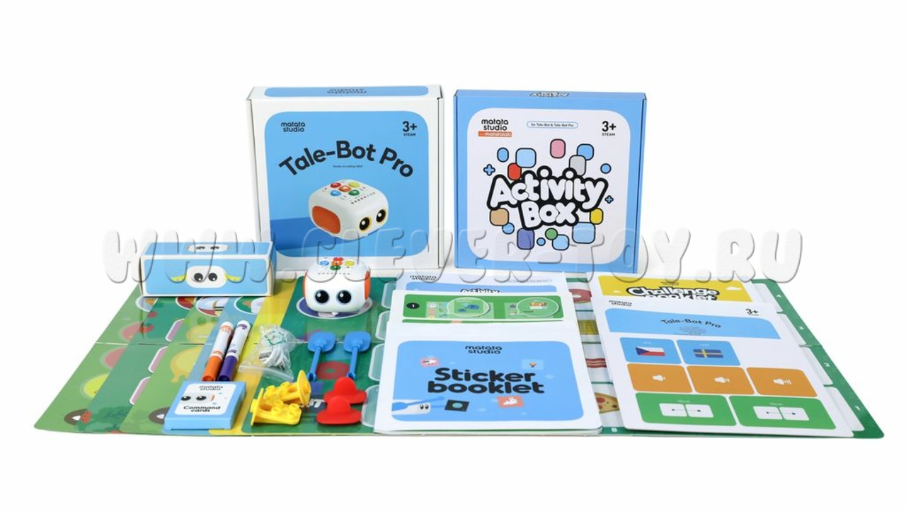 Комплект состоит из 6 роботов MatatalabTale-Bot и набора тематических карт, и стикеров.