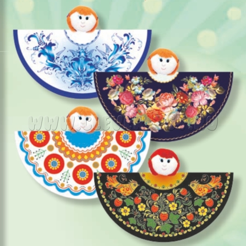В набор входят платковые куклы с изображениями народных художественных промыслов: гжель, дымковская роспись, жестовская роспись, хохломская роспись